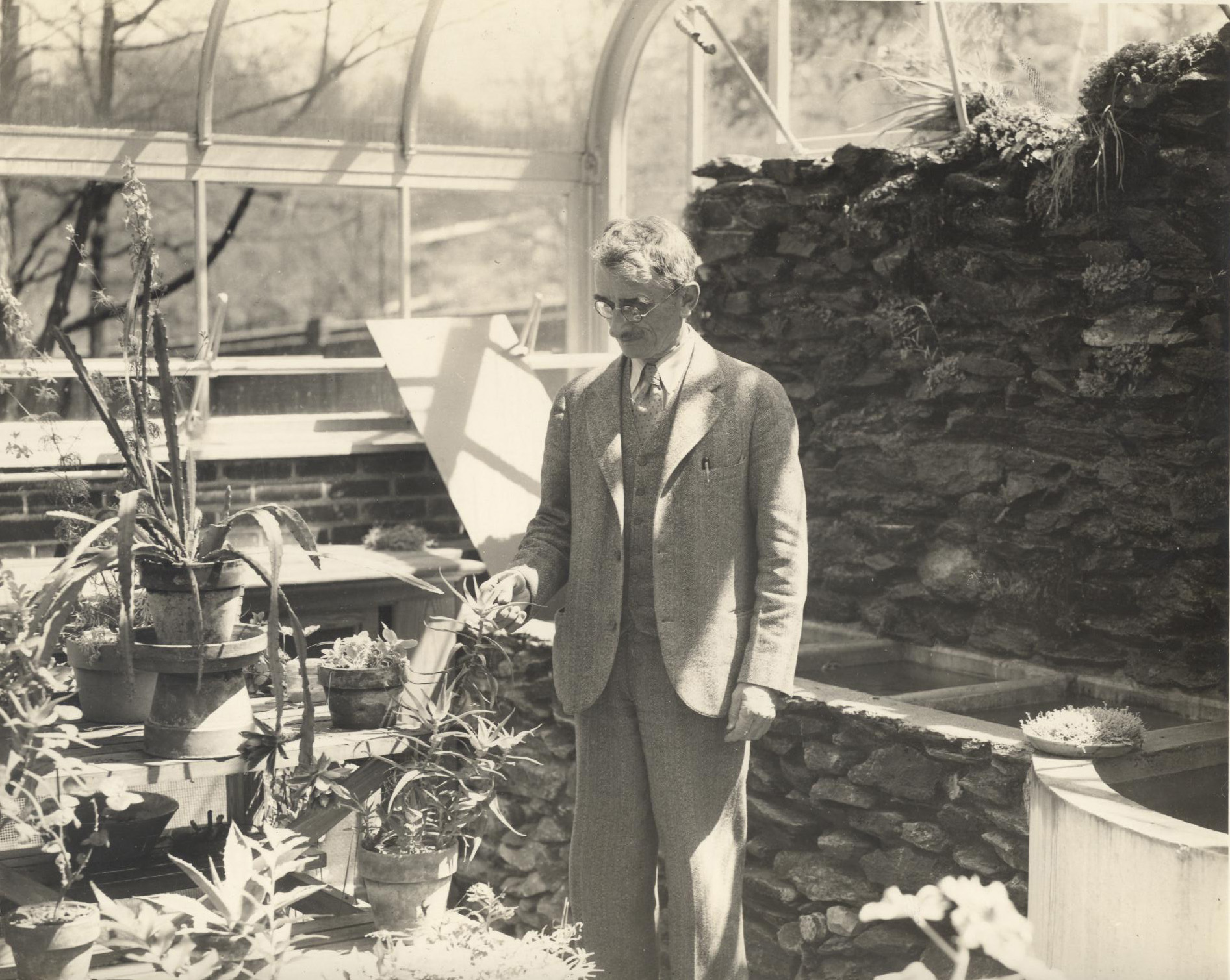 Dr. Hamaker in the Biology Department Greenhouse. (Randolph College Archives)